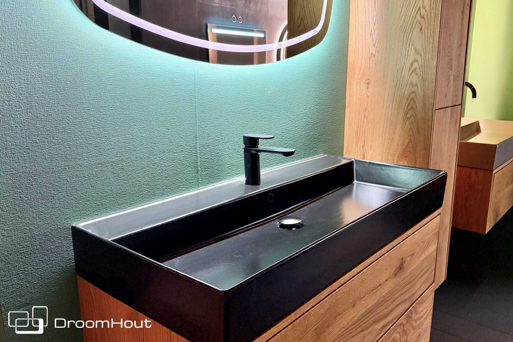 Bovenop ligt een zwarte zijdemat keramische wasbak. Slank van vorm, robuust in uitstraling. Het matte oppervlak vangt het licht subtiel en voelt prettig in gebruik. De zwarte kraan en bijpassende clickwaste versterken het geheel. Ton sur ton. Rustig. Zelfverzekerd. Hier is niets toevallig gekozen. Helemaal compleet met de prachtige dimbare design-spiegel.