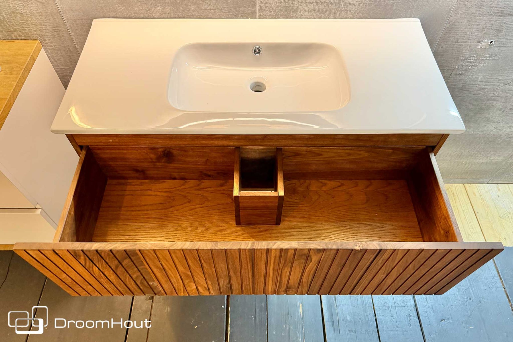Je krijgt een volwaardig DroomHout badkamermeubel met dezelfde materialen, dezelfde afwerking en dezelfde kwaliteit, maar dan voor een hele speciale prijs. En zoals dat gaat met showroommodellen: op is echt op.