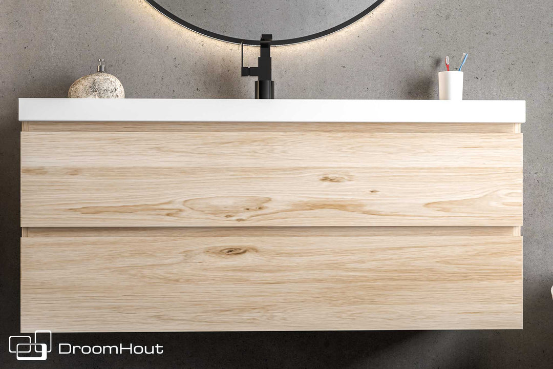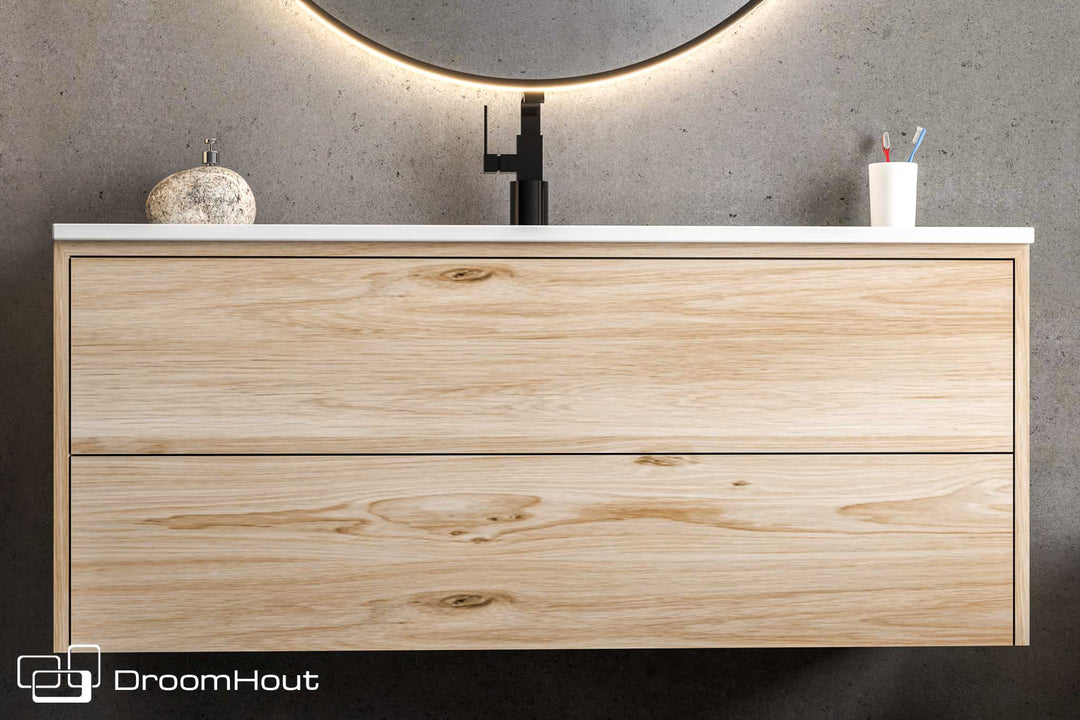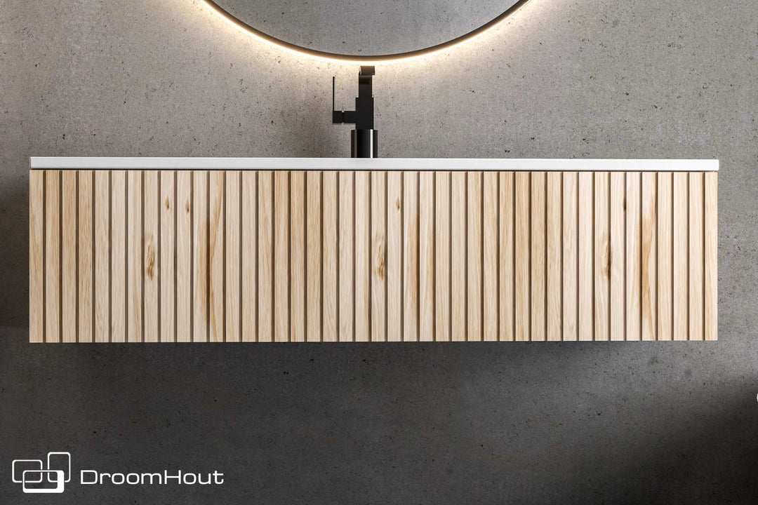 DroomHout biedt een verscheidenheid aan houten badkamermeubels van 120 cm, inclusief wastafels, kasten en combinatiemeubels die zowel stijl als functionaliteit aan uw badkamerruimte toevoegen.