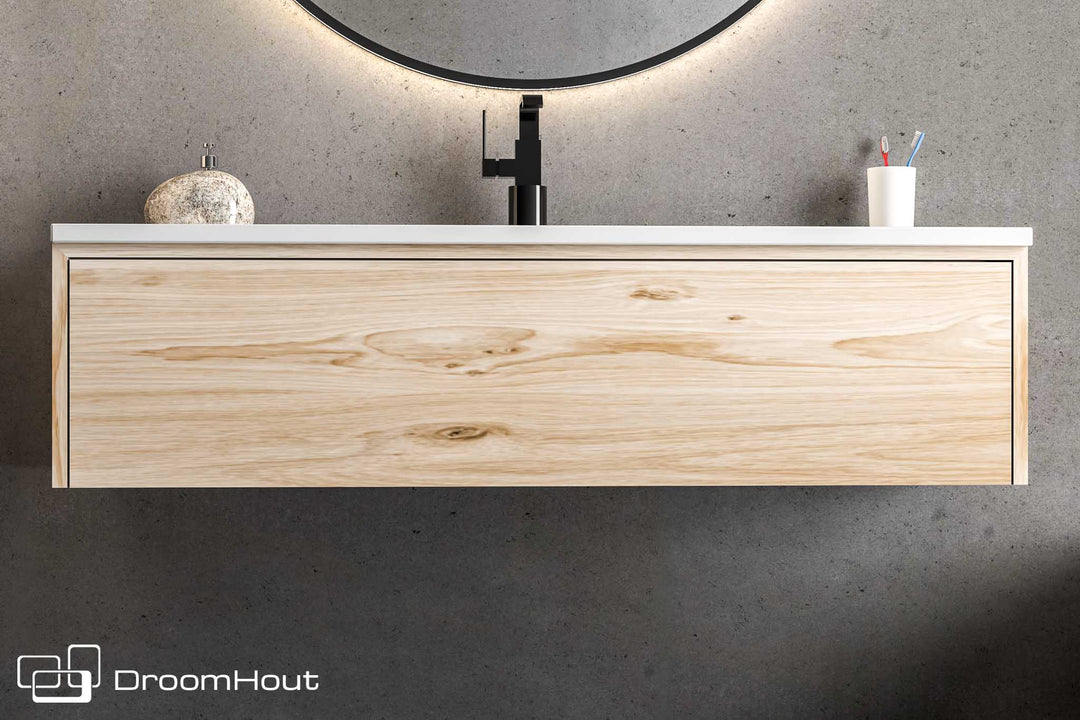 DroomHout voert een ruim assortiment aan maatwerk voor het houten badkamer meubel. Er is een houtsoort passend bij elke interieur stijl. Of je nu houdt van een industriële look of een landelijke stijl, hout is altijd de perfecte toevoeging. Hout sluit naadloos aan bij een landelijke uitstraling. Op zoek naar een wit badkamermeubel? Ook dit is mogelijk, neem bijvoorbeeld de Pure met lades. Dit is een strak wit meubel van solide MDF omkleed met hoogglans HPL en een mooie top van eikenhout. Het houten badmeubel kan helemaal worden aangepast aan jullie stijl want deze kan worden uitgevoerd en diverse kleuren en maten.