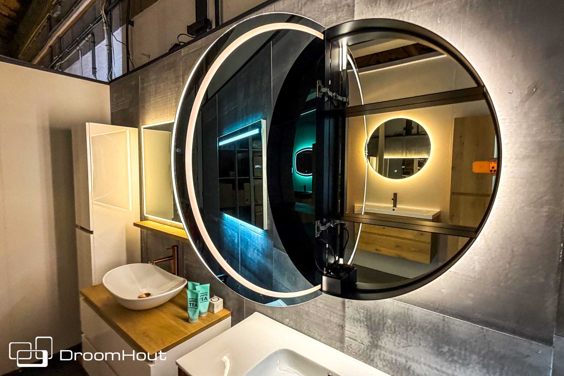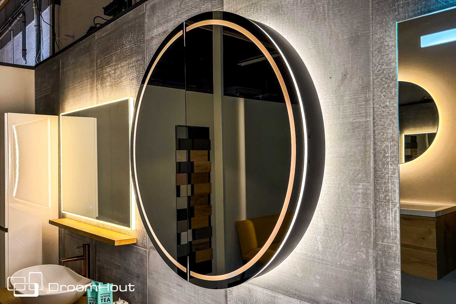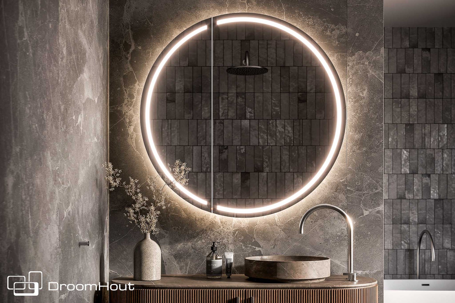De DroomHout Lech is ontworpen als een stille blikvanger die luxe brengt zonder te overheersen en die de badkamer laat voelen als een plek om even te vertragen. De ronde vorm verzacht de ruimte en brengt balans tussen strakke lijnen en warme materialen terwijl het licht rondom de spiegel een zachte gloed geeft die direct sfeer creëert. Het resultaat voelt rustig en vanzelfsprekend aan, alsof de spiegelkast altijd al onderdeel van de ruimte was.