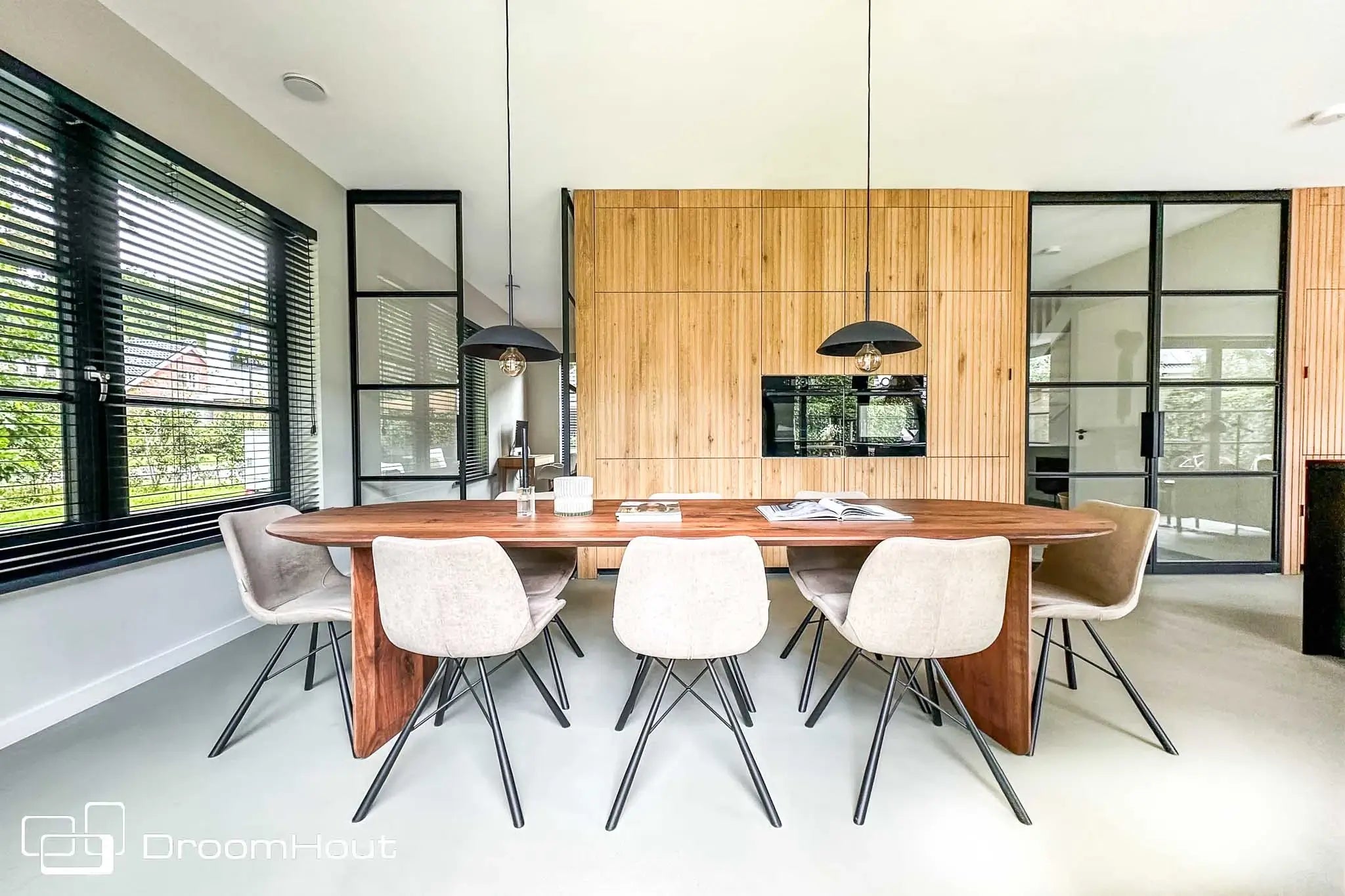 DroomHout makes dining tables, coffee tables, wall shelves, TV furniture, conference tables, desks, bathroom furniture, bathroom cabinets, kitchen fronts and wooden countertops. We make your furniture with a lot of passion and pleasure in our own dream factory in Utrecht. That is why we can also do custom work for you.